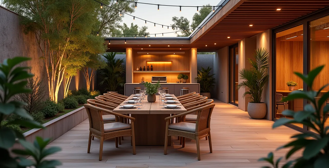 Der wahre Luxus eines Essplatzes im Freien liegt nicht im Preis der Möbel, sondern in der unsichtbaren Planung, die Komfort und Funktion nahtlos vereint.