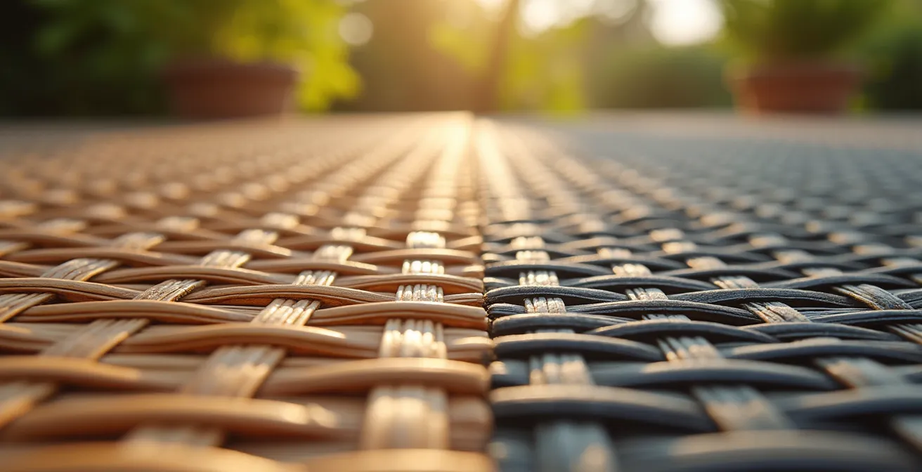 Viele Käufer assoziieren den Korb-Look mit natürlichem Rattan, doch Polyrattan ist ein industriell gefertigter Kunststoff, meist aus Polyethylen (PE). Gerade weil es ein künstliches Material ist, sind die Qualitätsunterschiede enorm und hängen direkt von den Herstellungsprozessen und den verwendeten Rohstoffen ab. Während die üblichen Ratschläge oft bei oberflächlichen Tipps wie „auf UV-Schutz achten“ enden, liegt die wahre Kunst der Auswahl darin, die materialtechnischen Schwachstellen zu verstehen. Es geht nicht darum, den höchsten Preis zu zahlen, sondern darum, die Physik und Chemie hinter der Haltbarkeit zu kennen.